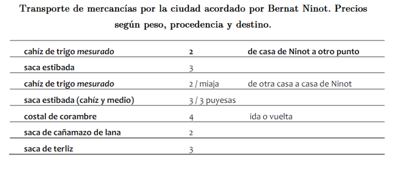 Se acuerda el transporte también dentro de un régimen de "compañía", esto es, de exclusividad y solidaridad. El mercader y ciudadano Bernat Ninot contrata a Gonzalo de Miedes, vecino de Zaragoza, para el transporte por la ciudad. Acuerdan de la siguiente manera (paccionaron e concordándose entre ellos en esta manera):